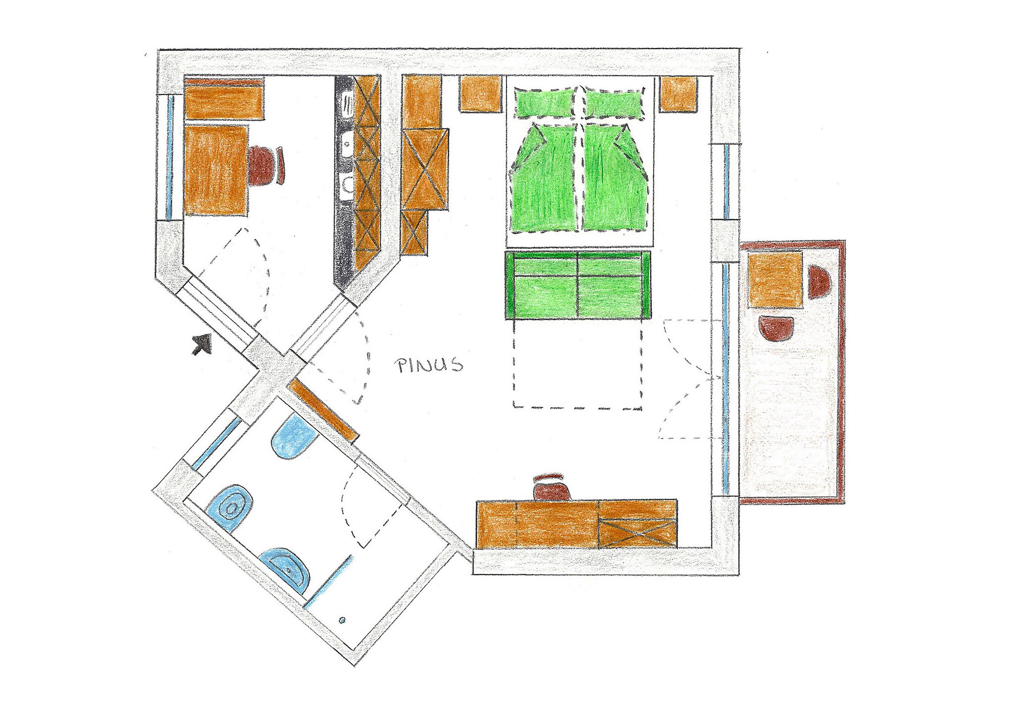 Sie benötigen mehr Platz? ⇒ Kombi-Apartment "PinusPLUS" (67 m2). Das Apartment 'Pinus' kann mit dem Zimmer 'Vitis' kombiniert werden.